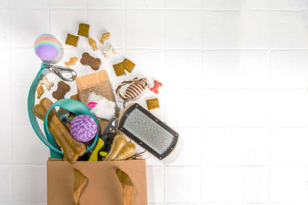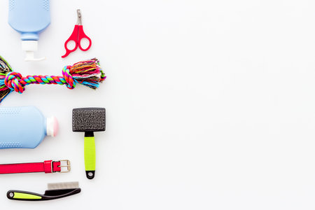 Pet accessories. Toys, equipment for grooming, bowl with feed and treats, on white background top view. flat lay with copy space