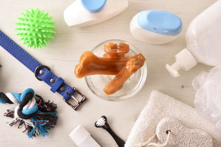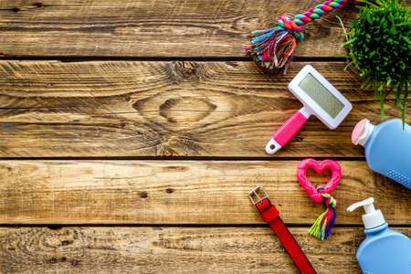 Pet care accessories on wooden background