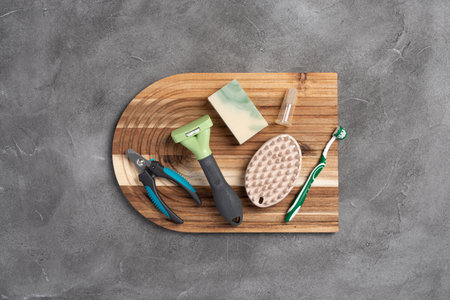 Pet care, hygiene and grooming tools on a grey concrete background. Different pet care accessories, top view, copy space