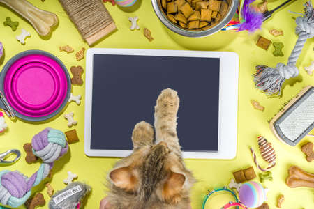 Pet food and accessories, various cat, dog, domestic animals food, toys, treats, utensils. Zoomarket and pet store, online shopping, pet care concept, flatlay banner top view copespace