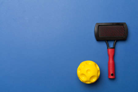 Pet brush and ball toys on color background.