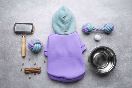 Flat lay composition with dog clothes, food and accessories on gray table