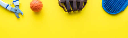 Banner with accessories for caring for the dog on a yellow background. Layout. Flat lay. Space for text.