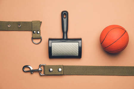 Pet brush, leash and ball on color background