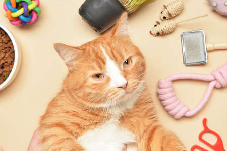 Cute cat with toys on beige background