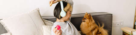 Asian girl in headphones playing with her ginger dog on bed at home