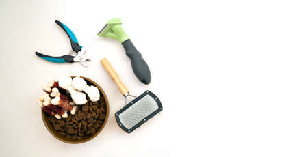 equipment for grooming pets. clipper, furminator and brush, bowl with feed and treats on white background with copy space. Pet accessories.
