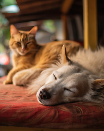 A cat sleeps peacefully beside a dog in a warm indoor space filled with pet accessories and soft colors showing their close bond.