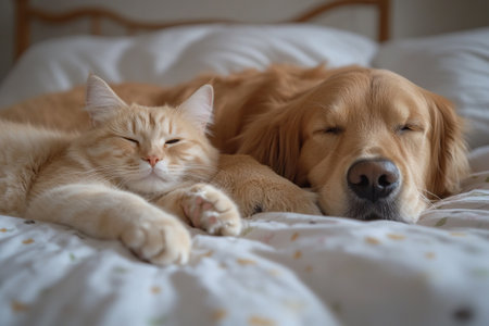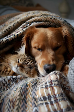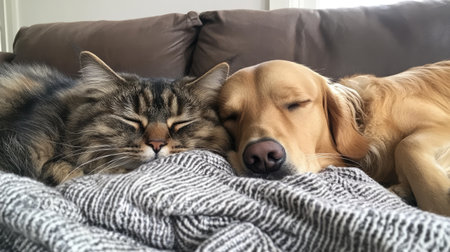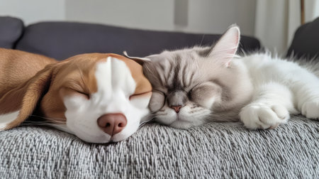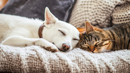 A charming scene of a dog and cat sleeping side by side on a cozy blanket, showcasing their affectionate bond and peaceful coexistence in a serene home environment.