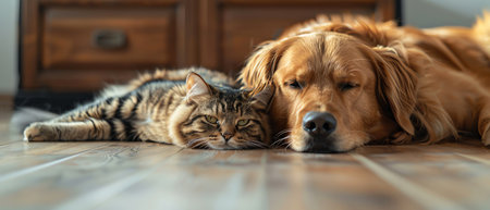 Cute Golden Retriever dog and cat lying on the floor