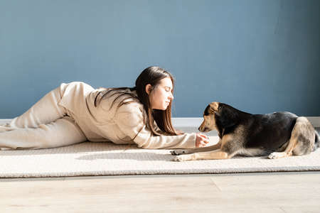 Beautiful brunette woman with playful mixed breed dog, embracing and having fun at home