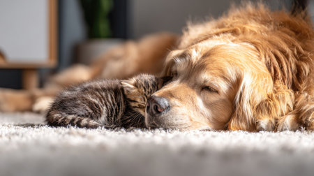 Adorable Golden Retriever puppy sleeping with tabby kitten at home.