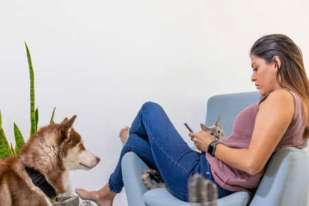 Woman with pets using smartphone at home