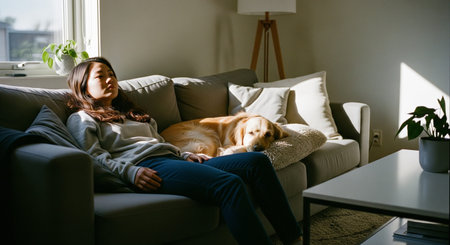 young asian woman relaxing on sofa with golden retriever dog at home