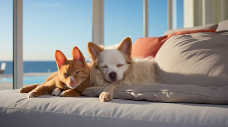 A cozy living room scene featuring a content dog and cat curled up side by side on a plush sofa, radiating tranquility and companionship.