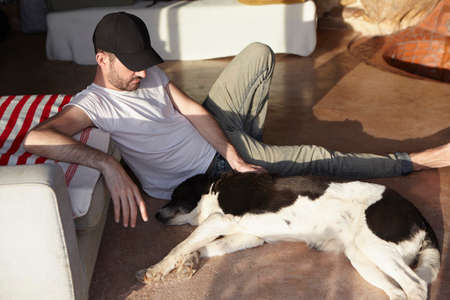 Mid adult man petting lazy dog on patio