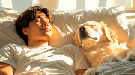 Young asian woman lying in bed with her dog at home.