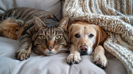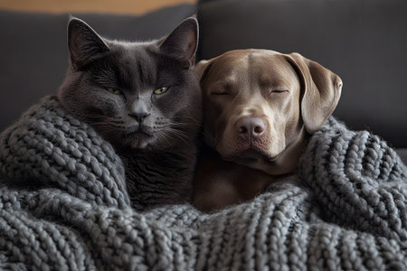 A gray cat and a tan dog peacefully rest together, snuggled under a thick gray knit blanket. the serene scene highlights the bond between these pets, showcasing warmth, comfort, and the joy of companionship. Generative AI