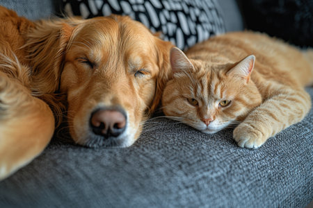 Golden retriever dog and cat sleeping together on sofa at home.