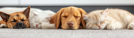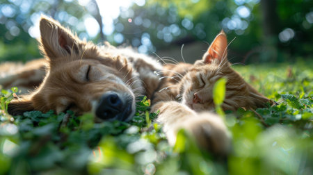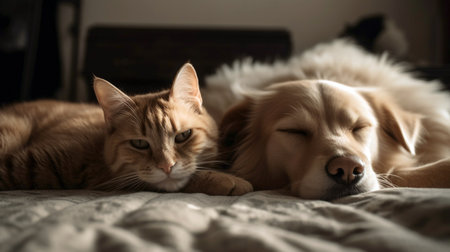 A heartwarming scene of a dog and cat peacefully napping side by side in a sunlit indoor space, capturing the essence of companionship and tranquility.