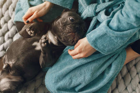 Elegant woman in a blue bathrobe with black bulldog