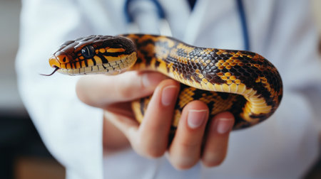 Veterinarian holding snake against vet clinic background - close-up. High quality photo