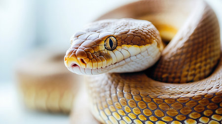 Close-Up Portrait of Coiled Snake, Scales Glistening Under Warm Light, Reptile Photography