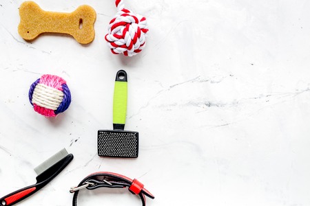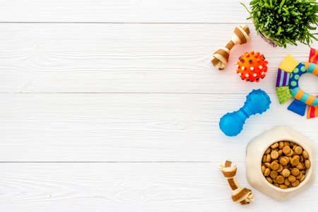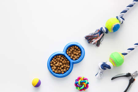 Pet accessories. Toys, equipment for grooming, bowl with feed and treats, on white background top view. flat lay with copy space