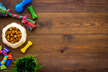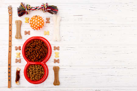 Pet accessories, food, toy. Top view