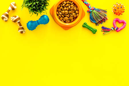 Flat lay composition with different pet goods on yellow background. Shop assortment