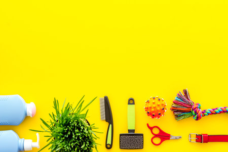 Banner with accessories for caring for the dog on a yellow background. Layout. Flat lay. Space for text.