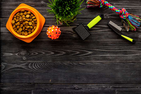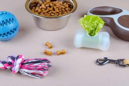 dried food for pets, leash and toys with comb, copy space