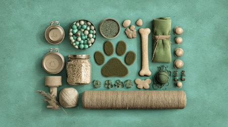 This banner displays pet service items arranged on a soft green background, showcasing eco-friendly materials and products for pet care.