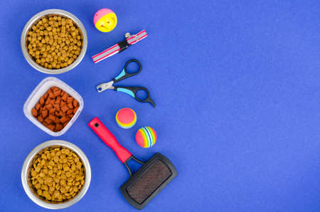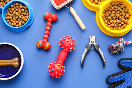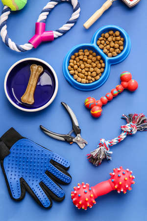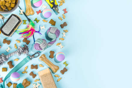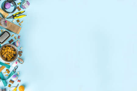 Pet care concept, various pet accessories and tools, toys, balls, brushes on blue background, flat lay pattern