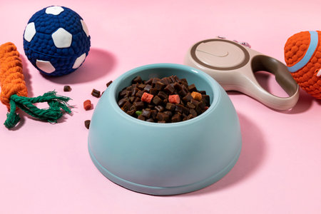 dried food in a bowl for pets, leash, toys and poop bags