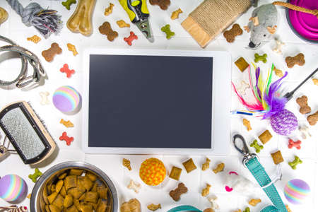 Pet food and accessories, various cat, dog, domestic animals food, toys, treats, utensils. Zoomarket and pet store, online shopping, pet care concept, flatlay banner top view copespace