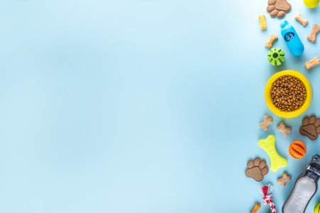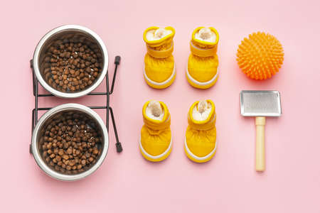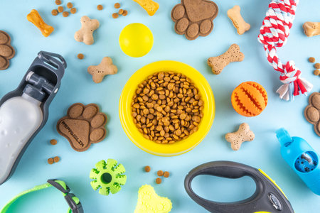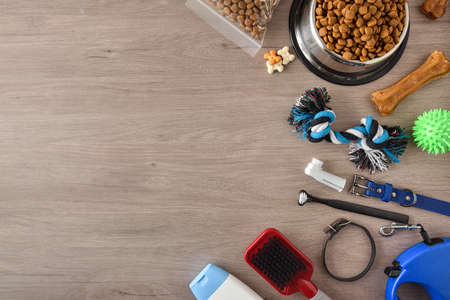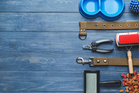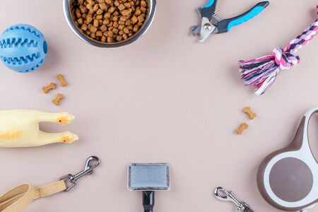 Top view of dog care and feeding accessories. Flat lay. Space for text.