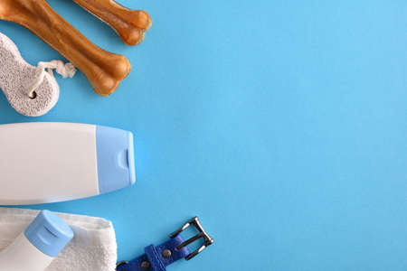 Canine hygiene for fur and body with products on blue cyan wooden table. Top view. Horizontal composition.