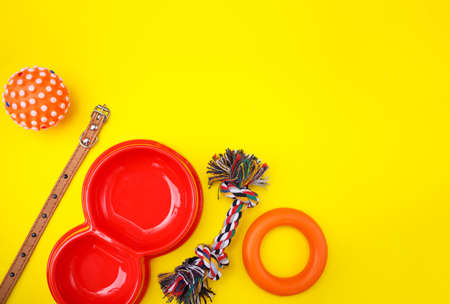 Set of accessories for the dog on a yellow background. Red bowl, collar, ball, goodies. Caring concept. Canine background. Top view, flat lay.