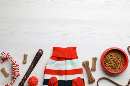 Flat lay composition with dog clothes, food and accessories on white wooden table. Space for text