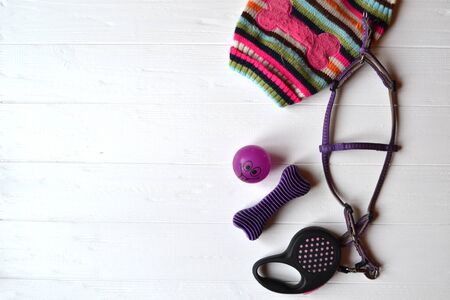 Rubber toys, leash and sweater for terrier dog. Pet's staff.