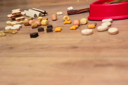 Pet food, snacks for dogs. Dog tasty colored biscuits on wooden background