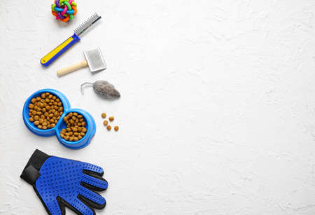 Different pet care accessories on light background
