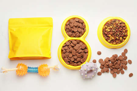 Dry pet food in bowl with toys and treats for dogs and cats