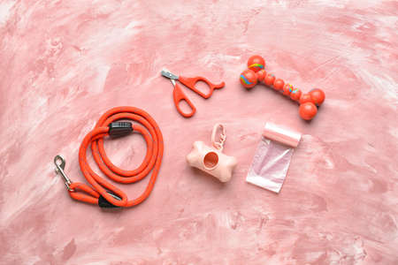 Pet waste bags and accessories on color background