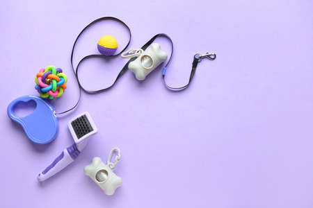Set of pet care accessories and waste bags on lilac background