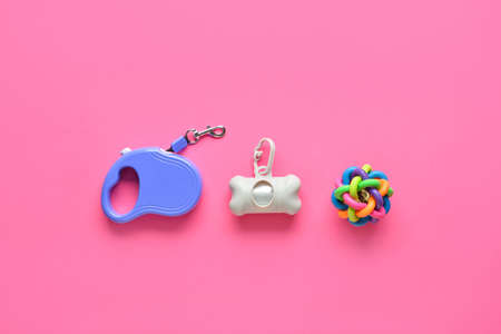 Dispenser with pet waste bags, toy and leash on pink background