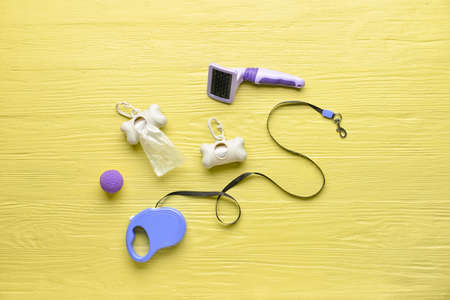 Different pet care accessories and waste bags on color wooden background