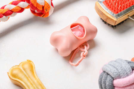 Set of pet care accessories with waste bags on light background
