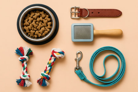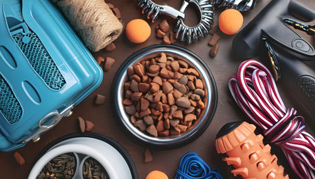 Pet care essentials with dog toys, food bowl, leash, and grooming brush for modern pet owners. concept of responsible pet ownership, pet supplies, canine accessories.